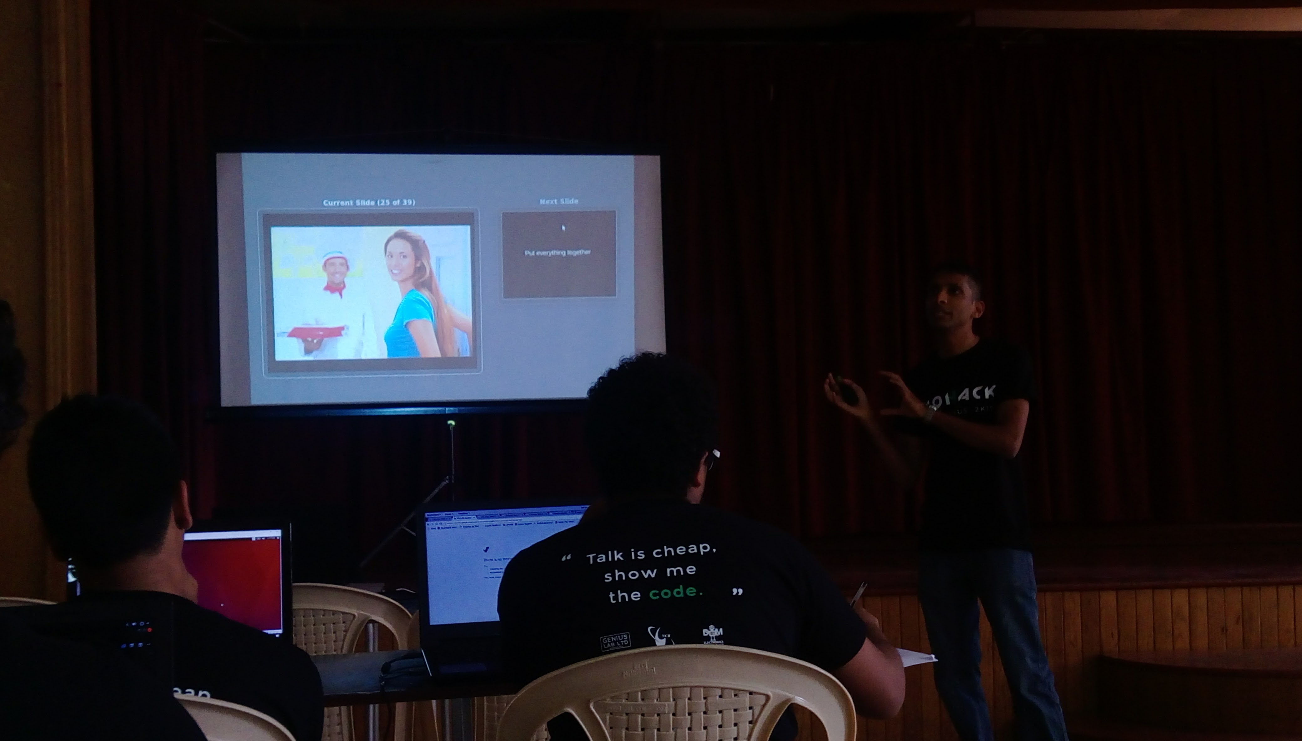 About an hour later, lunch is over and it’s now Codarren’s turn to take the stage. Before starting his presentation on Developing Extensions for Chrome, he spoke a bit about his contributions to open source projects and most importantly as a passionate coder with a particular liking for bug-hunting.